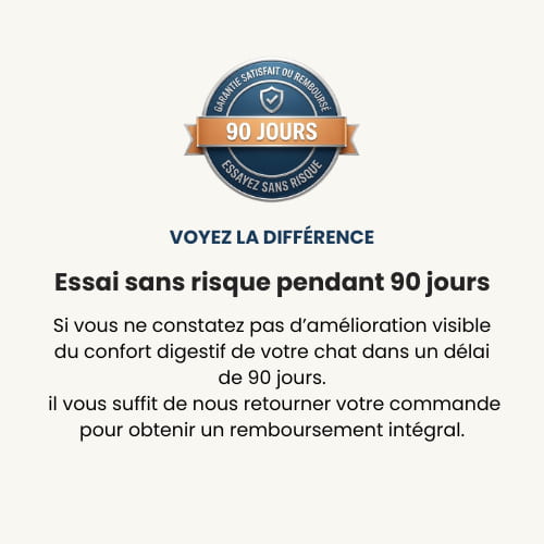 Nous sommes tellement convaincus de l'efficacité de nos gouttes que nous vous offrons la garantie la plus longue du marché. Si vous ne constatez pas une amélioration visible de la digestion, du transit ou de la vitalité de votre chat sous 90 jours, nous vous remboursons intégralement. Envoyez-nous un simple e-mail, nous ne poserons aucune question. Votre sérénité et la santé de votre compagnon sont nos seules priorités.
