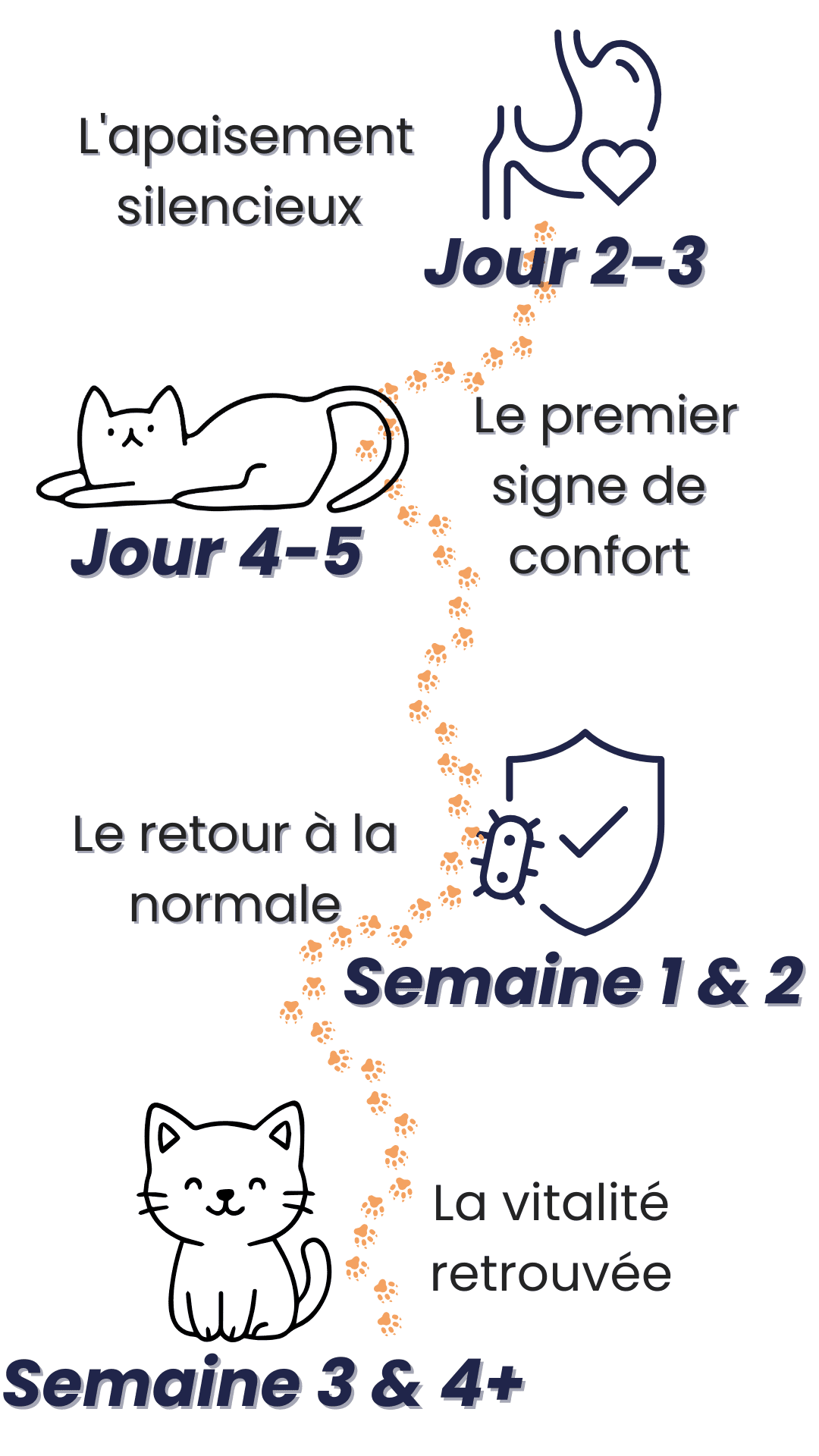 La plupart des propriétaires constatent une amélioration de la digestion et du transit dès les 7 premiers jours de cure. Pour une restauration profonde et durable du microbiome, nous recommandons une cure complète de 3 mois.